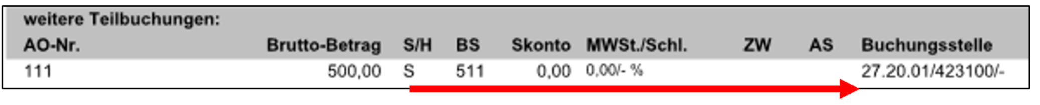 Sollte eine Eingabe mehrerer Teilbuchungen mit sich bringen, wie bspw. bei einer Aufteilungsbuchung, so gibt es auch hier am Brutto-Betrag ein Soll- oder Haben-Kennzeichen. Dieses bezieht sich auf die Spalte „Buchungsstelle“ in der Tabelle.
