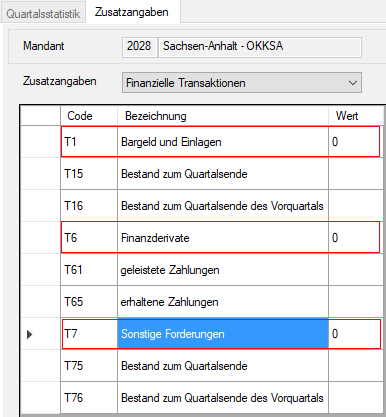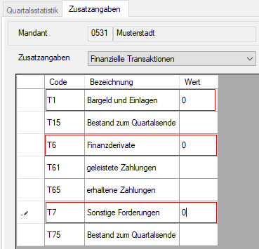 Für die vom Statistischen Landesamt geforderte Ausgabe der Zusatzangaben "Finanzielle Transaktionen" sind für die Codes T1, T6 und T7 Nullwerte zu hinterlegen, da diese ohne Relevanz für die Ausgabe der Kassenstatistik ab 2020 sind.