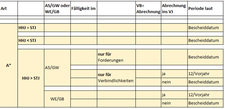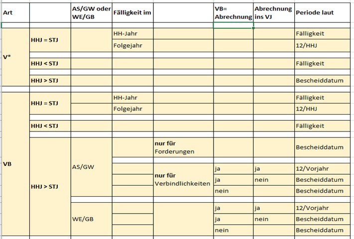 Die Buchungsperioden, die aus der Veranlagung heraus gebildet werden, wurde überarbeitet. Die Art der Veranlagung (allg. Steuern (AS) / wiederkehrende Abgaben (WE) / Gewerbesteuern (GW) / Gebühren GB)), die Positionen 'VB=Abrechnung' und 'Abrechnungen ins Vorjahr' haben dabei grundlegende Bedeutung.