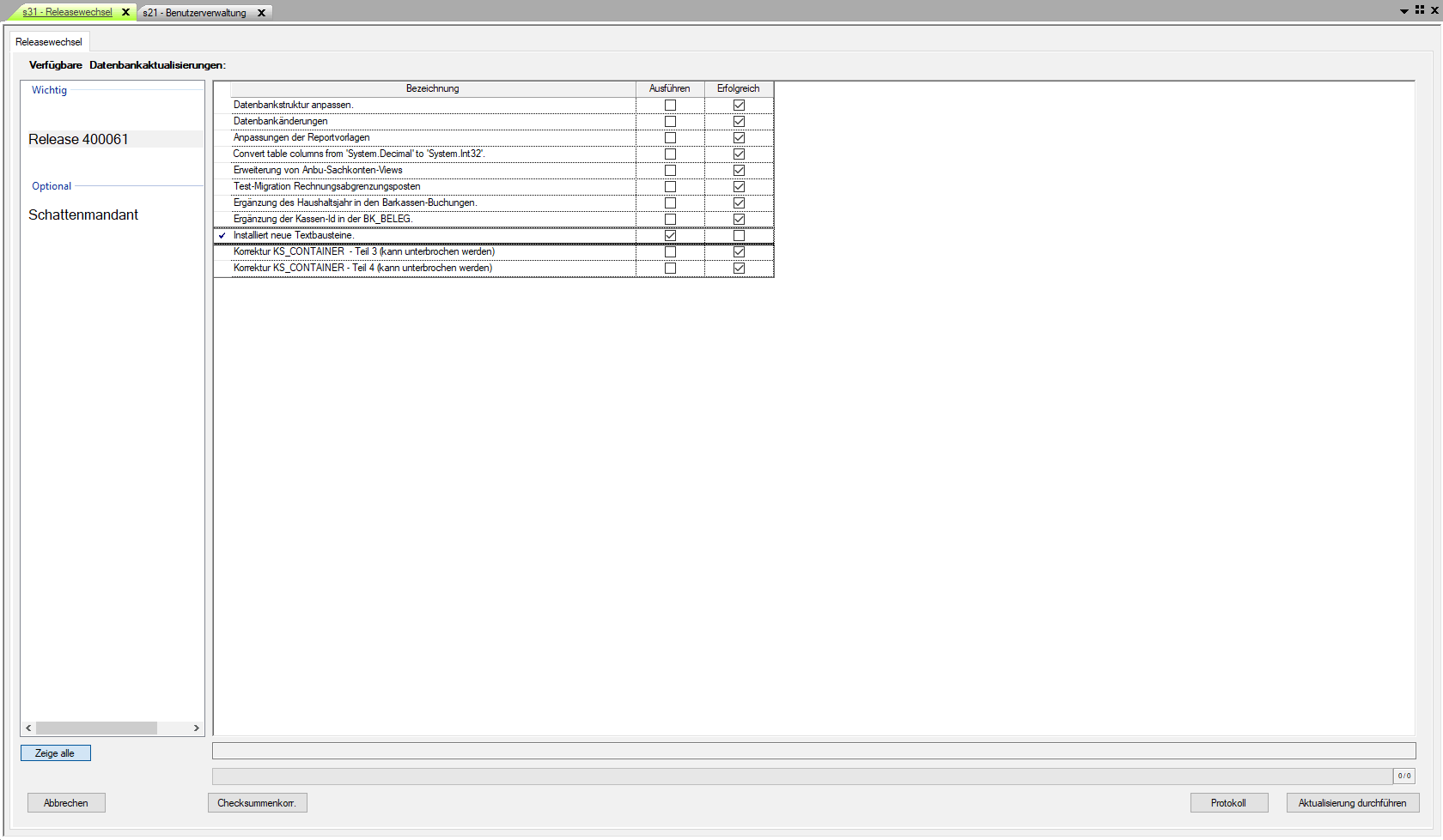 Nach Herunterladen und Installation des Updates kann der Releasewechsel für Release 61 durchgeführt werden. Falls aus Vorgänger-Releases noch offene Releasepunkte angezeigt werden, sind diese vorab - beginnend mit dem kleinsten noch offenem Release - auszuführen.