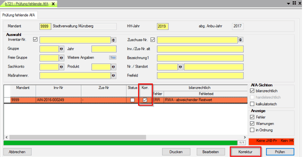 Eröffnungsbilanz-Positionen (Spalte „EB“ an der Bewegung) mit inkludierten AfA-Betrag, z.B. Außerplanmäßige-Abschreibung, führten bei Anlagegütern / Zuschüssen ab Release 62 zu fehlerhaften Restbuchwerten. Der inkludierte AfA-Wert, einer EB-Position, wurde ein weiteres Mal zur aufgelaufenen AfA dazugerechnet und anschließend vom AHK-Wert abgezogen. Dieses Fehlverhalten wurde korrigiert. Das oben beschriebene Fehlverhalten, lässt sich durch eine gezielte Neuberechnung der Abschreibung korrigieren. Um betroffene Anlagegüter / Zuschüsse identifizieren und korrigieren zu können, empfiehlt sich die „Prüfung fehlende AfA“ im Menü b721 auszuführen. Bei betroffenen Vermögensgegenständen wird die Fehlermeldung „RWA – abweichender Restwert“ angezeigt. Die Autokorrekturmöglichkeit wird durch einen Haken in der Spalte „Korr.“ signalisiert. Danach lässt sich der Fehler über den Button „Korrektur“ beheben. Anschließend sollte gezielt für etwaig betroffene Vermögensgegenstände, bei denen die AfA bereits verbucht war, die Buchung der Abschreibung erneut vorgenommen werden.