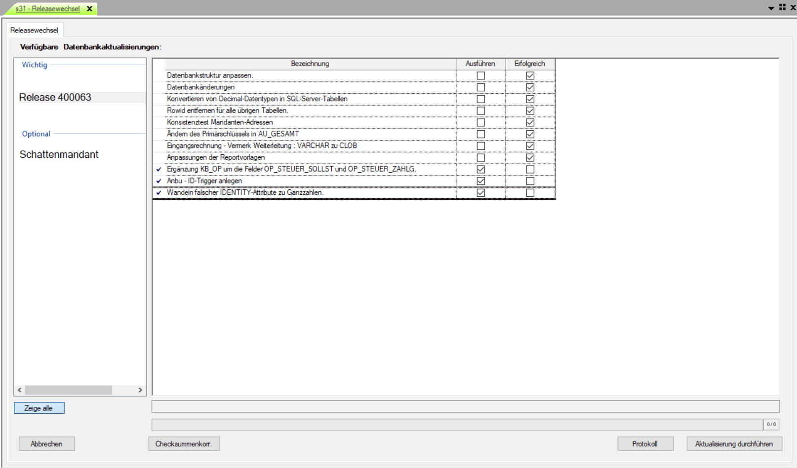 Alle RW-Punkte, welche auf "ausführen" stehen durchführenNeue Releasewechselpunkte: * „Ergänzung KB_OP um die Felder OP_STEUER_SOLLST und OP_STEUER_ZAHLG.“ Befüllt die Spalten OP_STEUER_SOLLST und OP_STEUER_ZAHLG., die für die Steuerberechnung bei Zahlungsbuchungen wichtig sind.„Anbu - ID-Trigger anlegen“ (nur Microsoft SQL Server Datenbank; bei Oracle läuft dieser Punkt ohne Änderungen durch) Mit diesem Releasewechsel-Punkt wird das folgend beschriebene Fehlverhalten behoben: Nach der Ausführung Releasewechsel auf das Release 63, insbesondere des Punktes „ROWID entfernen für alle übrigen Tabellen“ (nur Microsoft SQL Server Datenbank), war es in bestimmten Konstellationen nicht mehr möglich, in der Anlagenbuchhaltung Neuerfassungen von Anlagegütern, Zuschüssen sowie Bewegungsbuchungen vorzunehmen.