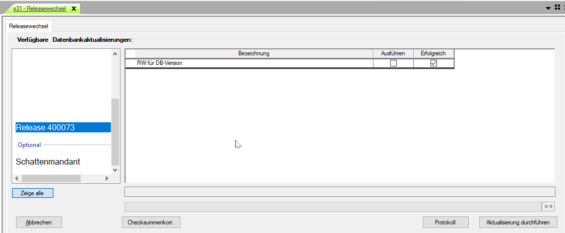Nach Herunterladen und Installation des Updates kann der Releasewechsel für Release 73 durchgeführt werden. Falls aus Vorgänger-Releases noch offene Releasepunkte angezeigt werden, sind diese vorab - beginnend mit dem kleinsten noch offenen Release - auszuführen.