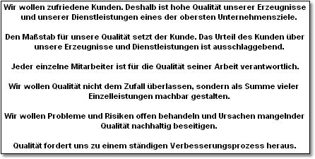 „Mit den Qualitätsgrundsätzen sind die Anforderungen der Qualitätspolitik in verpflichtende Ziele gefasst und allen Mitgliedern des Unternehmens bekannt gemacht und als Aufgabe übertragen.