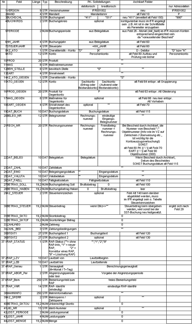 Datensatzaufbau der Archikart-Stapelschnittstelle zur Übernahme von Buchungssätzen (inkl. RAP-Informationen) und Adressdaten aus Archikart. Die Felder sind analog der Standardschnittstelle durch einen Delimiter zu trennen (Standard „|“), andere Zeichen sind möglich.Die Daten sind als ASCII-Datei zu übergeben (ISO-8-bit -ISO 8859). Satzendekennzeichen ist 0d0a.