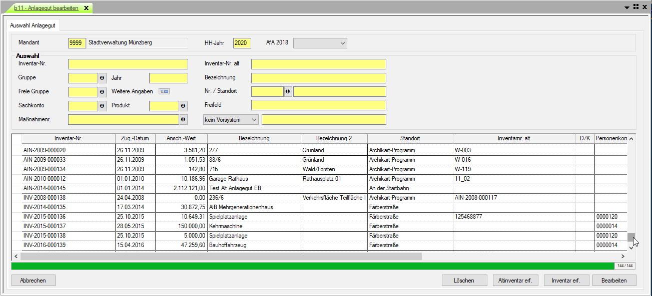 Die maximale Satzanzahl in den Übersichtstabellen des Programmes unterliegt den Beschränkungen in der Systemverwaltung (Systemparameter - Maxrows) und beträgt bei Auslieferung 1000 Datensätze. Eine komplette Anzeige aller Anlagegüter ist dadurch auch ohne zusätzliche Eingaben in den Suchfeldern meist nicht möglich, da i.d.R. wesentlich mehr Inventargüter verwaltet werden. Zu diesem Zweck sollte die Anzeige etappenweise erfolgen.
