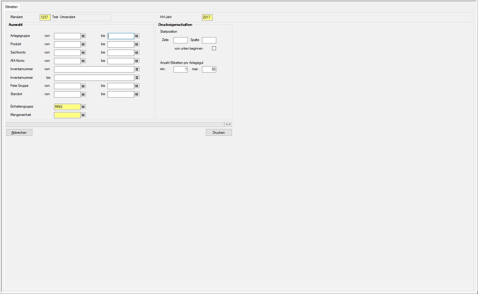 Dieser Menüpunkt bietet die Möglichkeit, für die angelegten Inventargüter einen Etikettendruck zu deren Kennzeichnung durchzuführen.