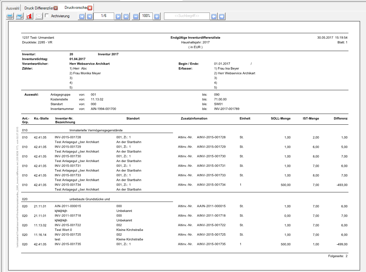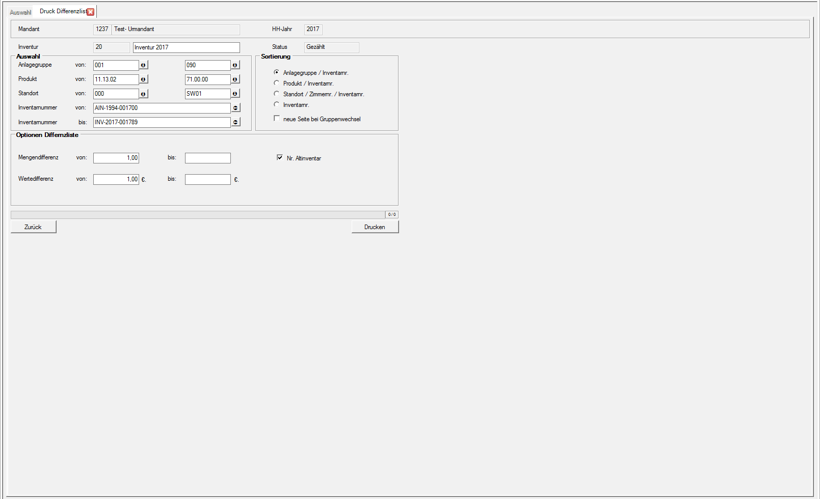 Einschränkung der zu druckenden Differenzliste auf bestimmte Inventarnummern