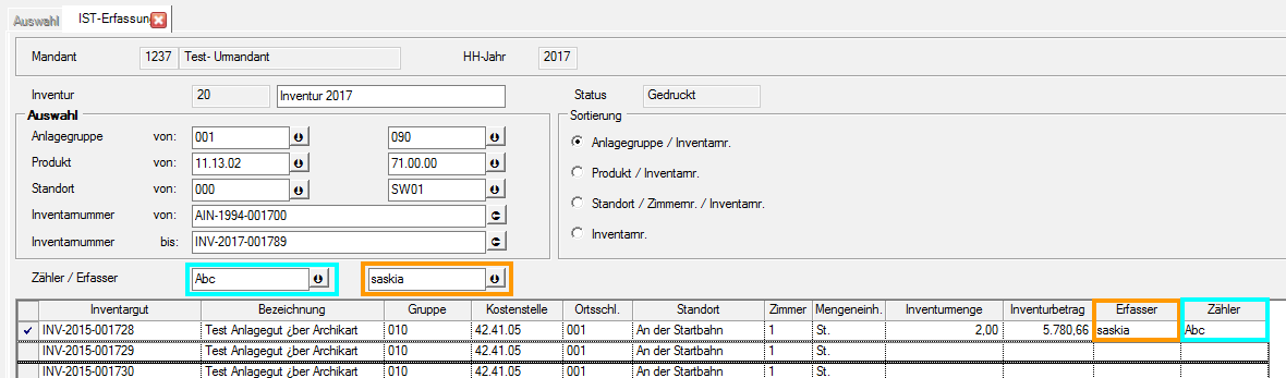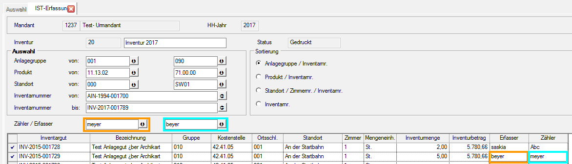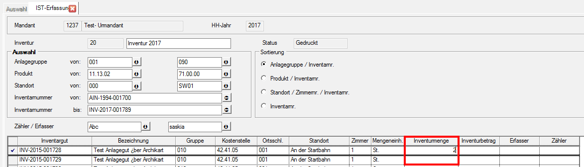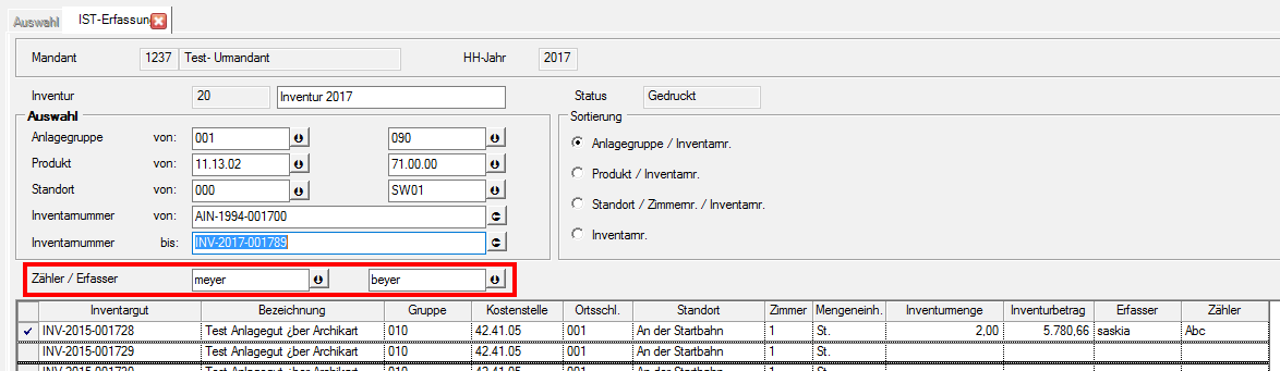 | Mit Klick auf die nächste Position befüllen sich von selbst die Spalten Inventurbetrag, Erfasser, Zähler |  |