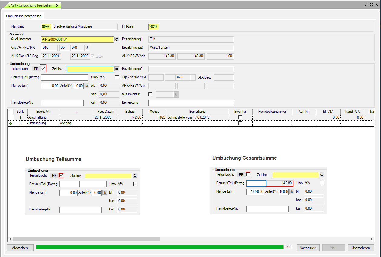 Nach Auswahl der Quell-Inventarnummer sind über den Button "Neu" die Eingabefelder im Bereich "Umbuchung" frei und es kann mit der Erfassung der weiteren Daten zur Umbuchung begonnen werden. Sind nur Teile des Quellinventargutes umzubuchen, wird mit aktiver Option „Teilumbuch.“ die Eingabe abweichender Werte in den Feldern "Umbuch.-Betrag", "Menge(St.)" bzw. "Anteil(%)" möglich. Durch das Entfernen des Hakens werden diese Felder inaktiv und gleichzeitig mit den erforderlichen Werten einer Vollumbuchung gefüllt. Über den Button „Übernehmen“ werden die eingetragenen Werte als Umbuchung verbucht. Fehlerhafte Umbuchungen sind als negative Umbuchung und zusätzlich der korrekte Wert als Umbuchung bzw. der Restbetrag als weitere Umbuchung zu erfassen. Korrekturen in bereits übernommenen Sätzen sind nicht möglich.