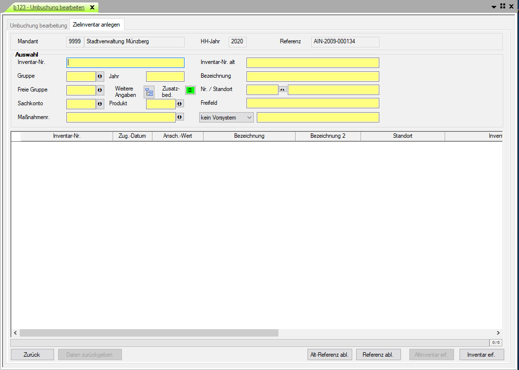 Soll auf ein neues noch nicht bestehendes Inventargut umgebucht werden, gibt es zwei Möglichkeiten dieses neue Ziel-Inventar zu erfassen bzw. anzulegen. Über den Button neben dem Feld „Ziel-Inv.“ wird auch hier zuerst in die Inventar-Auswahlmaske gewechselt. Nun kann sowohl über