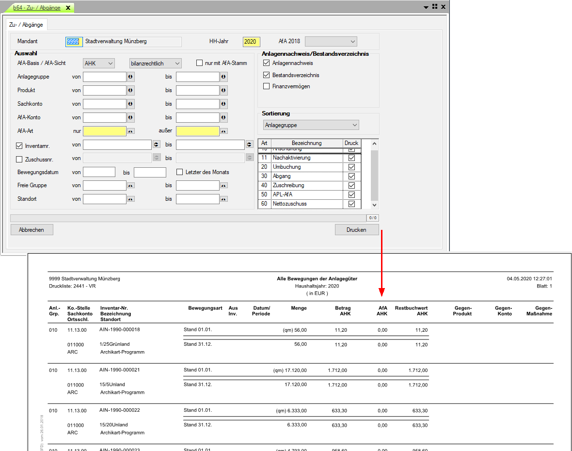 Mit Erstellung dieser Druckliste können alle Bewegungen und Sonderfunktionen zu den Anlagegütern aufgelistet werden.