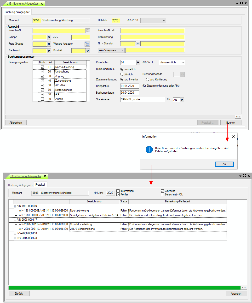 In Abhängigkeit der ausgewählten Buchungsvorgänge wird über den Button "Buchen" die Zusammenstellung der Berechnungsdaten zu einem Buchungslauf vorgenommen.