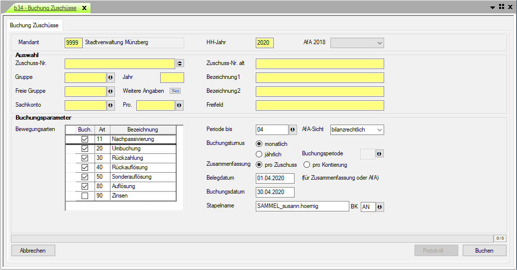 Menü b121 Nachaktivierung >> Menü b34 Buchung Zuschüsse >> Menü b35 Buchung >> Menü 36 und 33 AO-Druck und Buchung IFR Nach Angabe von Mandant und Haushaltsjahr kann über die nachfolgenden Suchfelder der Berechnungsumfang eingeschränkt werden. Außerdem besteht die Möglichkeit, Berechnungen nur für einzelne Vorgänge durchzuführen. Dazu sind die gewünschten Bewegungsarten mittels Mausklick aus- bzw. abzuwählen, standardmäßig werden alle Bewegungsarten zur Berechnung vorgeschlagen. Anschließend sind weitere Angaben zur Erstellung des Buchungslaufes notwendig. Die Angabe der nächsten Felder entscheidet im Feld "Periode bis" über den zu berechnenden Zeitraum und im Feld "AfA-Sicht" über die anzuwendende Abschreibungsmethode. Durch die gewählte Option unter "Buchungsturnus" wird entweder die Erstellung von periodengerechten Buchungen oder einer jährlich zum angegebenen Stichtag stattfindenden Sammelbuchung festgelegt. Je nach Auswahl im Punkt "Zusammenfassung" werden die Buchungen später im Buchungsstapel einzeln je Zuschuss (empfohlen) ausgewiesen oder zu Sammelbuchungen nach Buchungsstellen zusammengefasst. Unter Angabe von Beleg- und Buchungsdatum, eines eventuell individuellen Stapelnamens und des Buchungskreises erfolgt über den Button "Buchen" die Aufbereitung der Buchungsdaten. Die vorgenommenen Berechnungen oder dabei aufgetretene Fehler können in einem Protokoll über den gleichnamigen Button angezeigt werden.