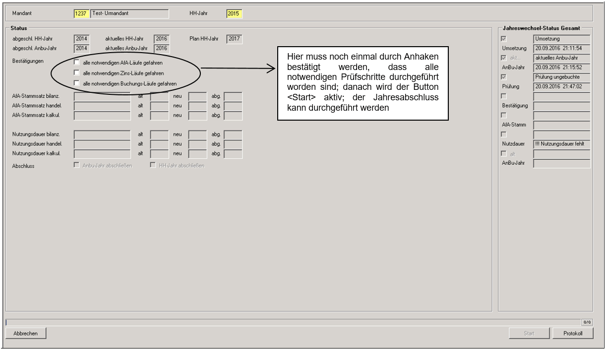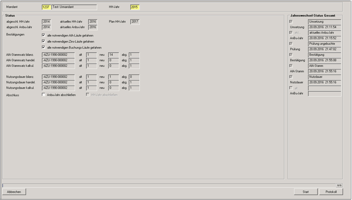 Nach der Wahl des Mandanten und des Haushaltsjahres werden die Statusanzeigen und informatorischen Jahresangaben auf der Maske aktualisiert. Auf Basis der im Menüpunkt " Neues AnBu-Jahr " erfolgreich durchgeführten Prüfungen wird zusätzlich im rechten Teil des Dialogfensters der erreichte Jahreswechsel-Status Gesamt angezeigt. Dabei ist die Erledigung der ersten 3 Prüfungen die Voraussetzung für die weitere Arbeit in dieser Dialogmaske. Danach wird mit dem Setzen der oberen 3 Optionshaken die Bestätigung für die korrekt durchgeführten AfA-, Zins- und Buchungsläufe erteilt und damit der Button "Start" aktiviert. Mit der anschließenden Betätigung dieses Buttons werden in einem ersten Schritt die AfA-Stammsätze der Anlagegüter für alle AfA-Sichten und die diazugehörigen Nutzungsdauerangaben in das Folgejahr übernommen. Nach erfolgreicher Umsetzung kann nun in einem zweiten Schritt durch Auswahl der entsprechenden Option das Anbu-Jahr abgeschlossen werden. Über den Button "Protokoll" kann im Anschluss getrennt nach unterschiedlichen Stati eine detaillierte Liste der Aktivitäten und Prüfergebnisse ausgegeben werden.