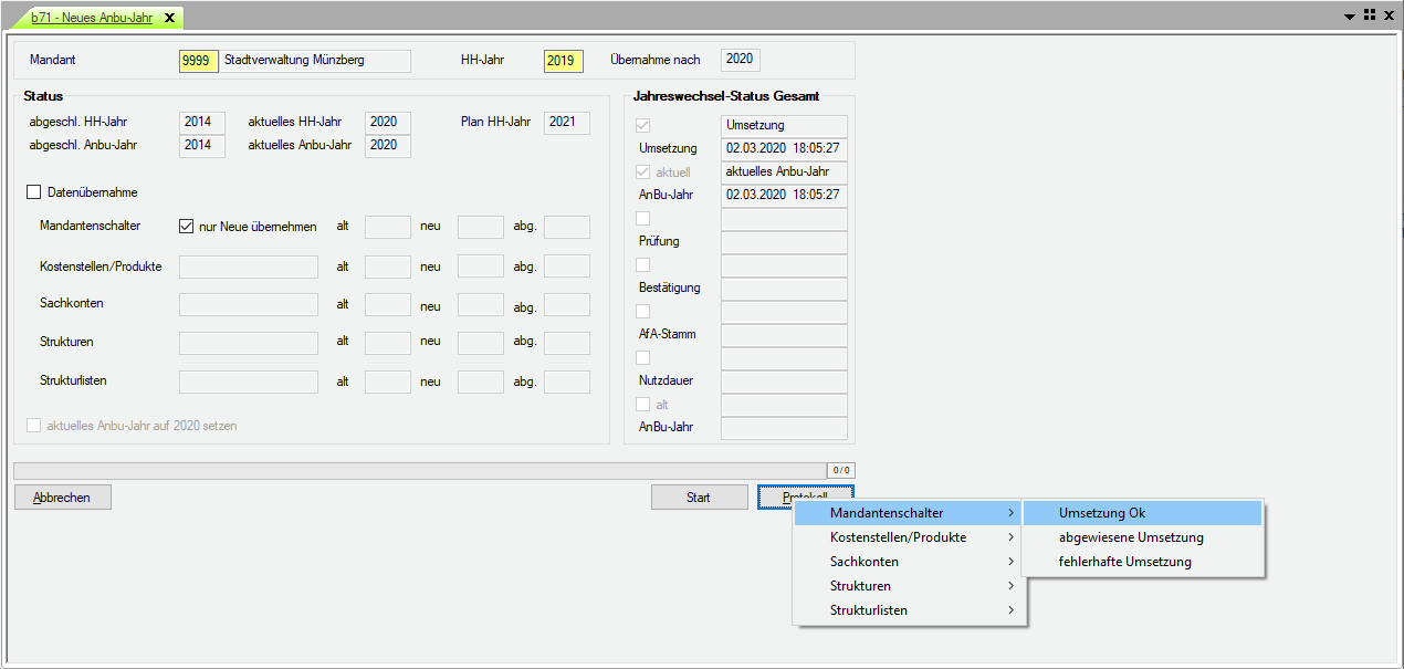 Nach erfolgreicher Umsetzung kann nun in einem zweiten Schritt durch Auswahl der entsprechenden Option das aktuelle Anbu-Jahr auf das aktuelle Haushaltsjahr (AnBu-Folgejahr) angeglichen werden.