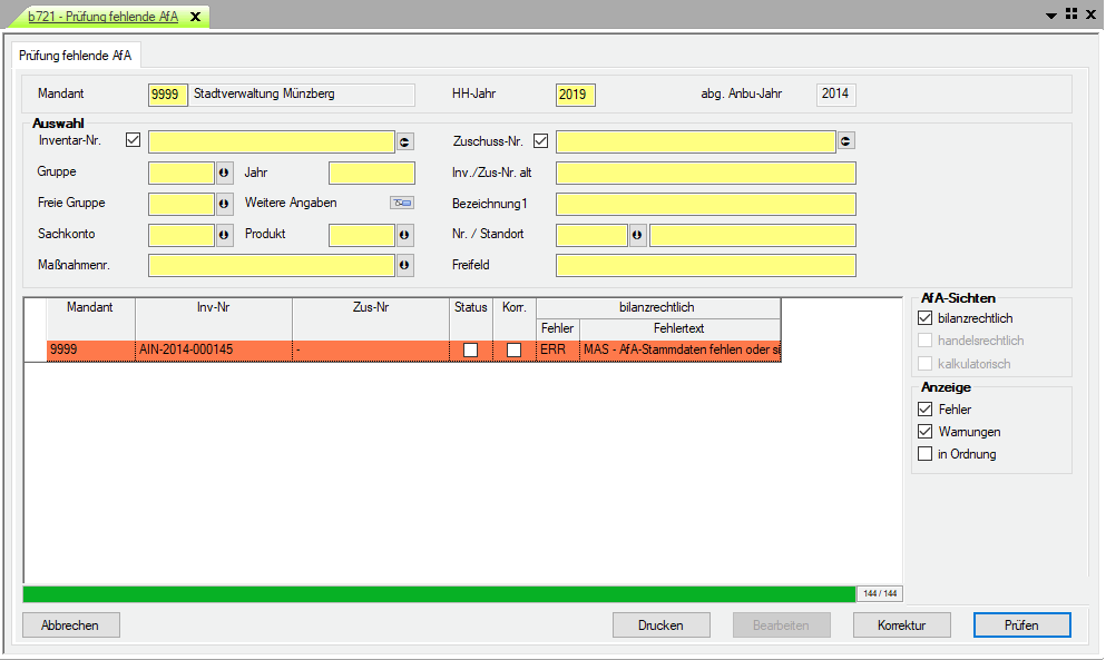 Es startet der Prüflauf für die vorhandenen Inventargüter auf fehlende bzw. fehlerhafte Abschreibungs- und Stammdaten.