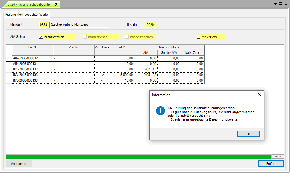 Es startet der Prüflauf für die vorhandenen Inventargüter auf fehlende Abschreibungswerte.