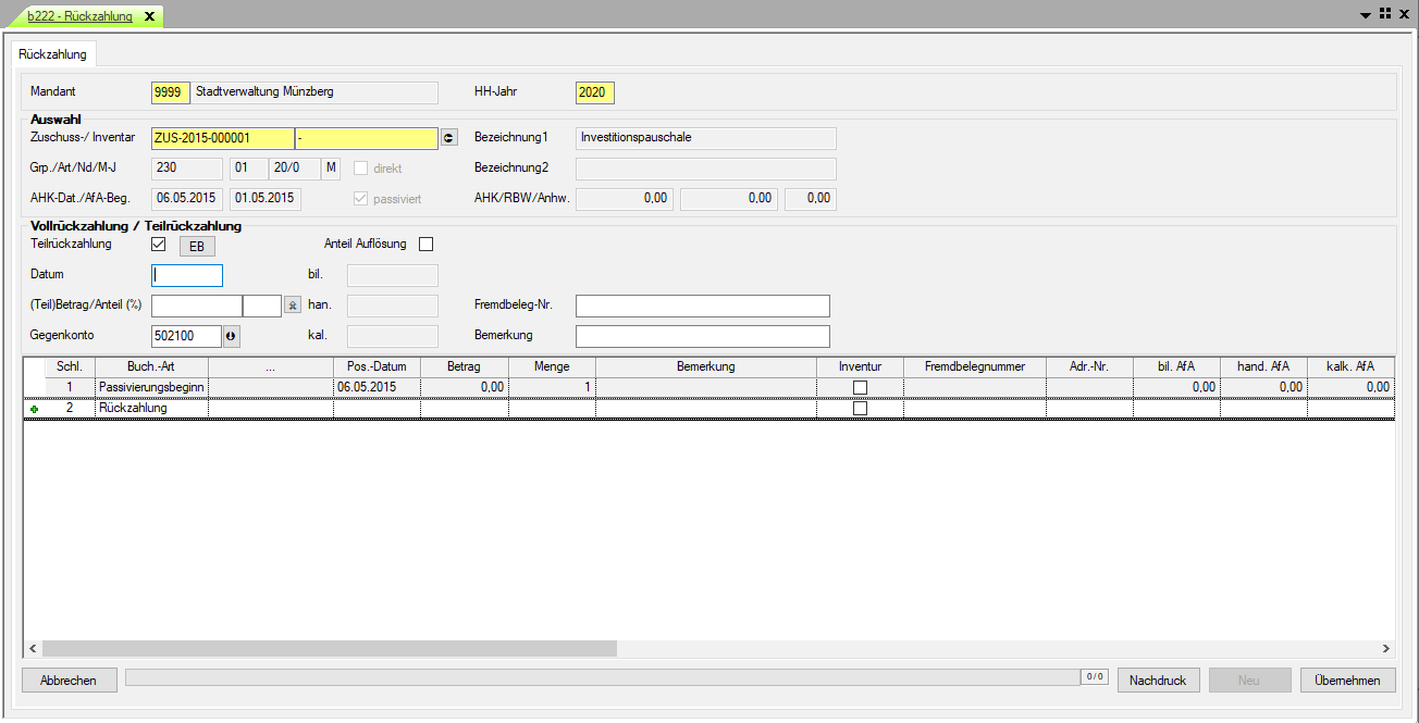 | Navigator | Anlagenbuchhaltung - Zuschüsse - Zuschussfunktionen - Rückzahlung/Abgang |