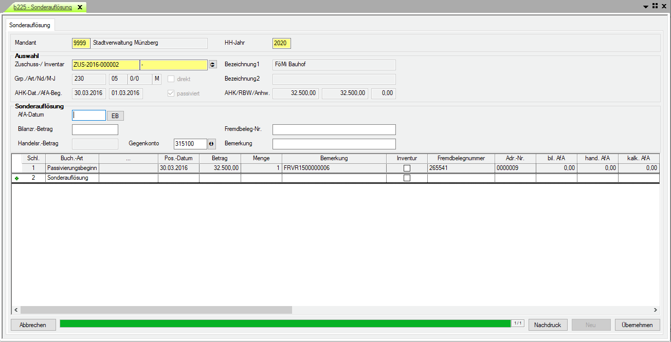 Über die Funktion "Sonderauflösung" können spätere Korrekturen zu einem bereits vorhandenen und in Abschreibung befindlichen Zuschuss vorgenommen werden.