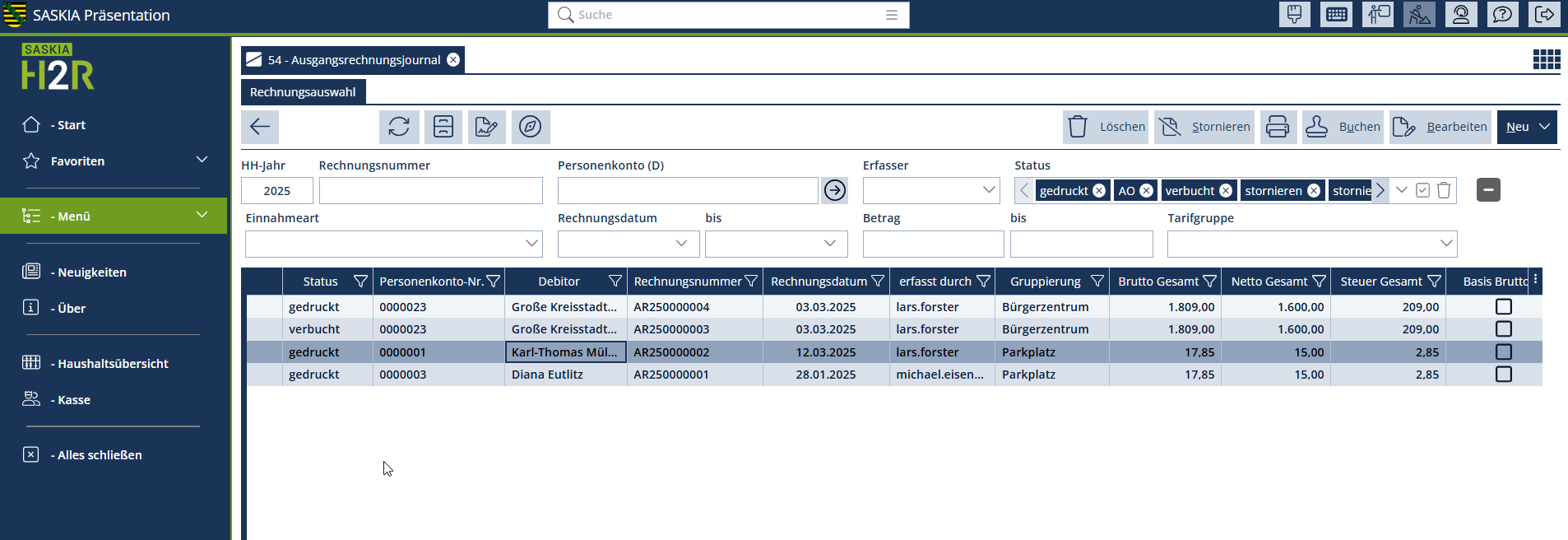 Im Einstiegsfenster des Ausgangsrechnungsjournals werden entsprechend der angegebenen Suchkreterien die vorhandenen Ausgangsrechnungen des aktuellen Haushaltsjahres aufgelistet. Die Rechnungen können je nach Stand ihrer Verarbeitung aus dieser Maske heraus durch Klick auf die jeweiligen Button storniert, gelöscht, gebucht, gedruckt oder bearbeitet werden. Dazu wird eine Rechnung zur Bearbeitung, durch einen Klick auf die jeweilige Zeile markiert. Die Auswahl von mehreren Einträgen gleichzeitig, erfolgt durch Zuhilfenahme der Strg-Taste und Klick auf die gewünschten Zeilen. Über den DMS-Button können im Nachgang alle dazugehörigen Buchungsbelege (z.B. die Anordnung) eingesehen werden.
