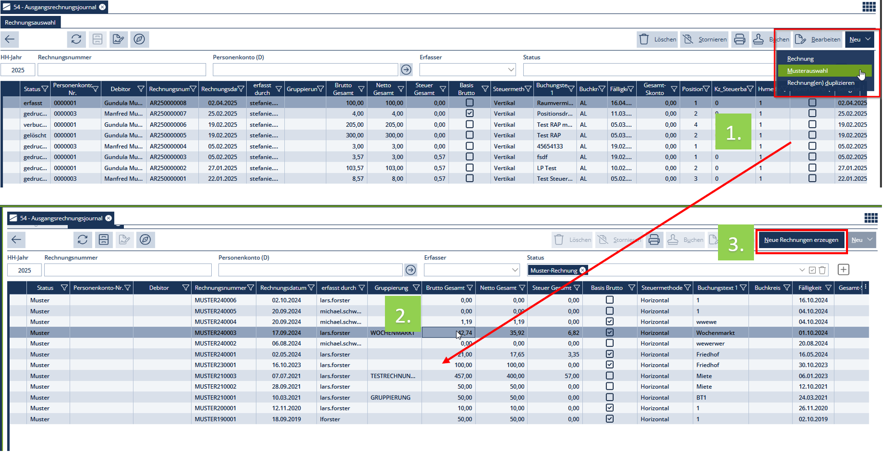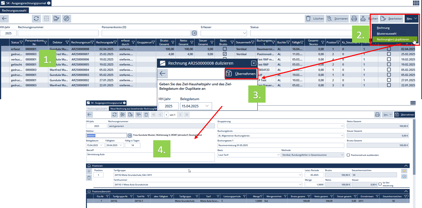 In der Übersicht im Ausgangsrechnungsjournal muss eine Muster-Ausgangsrechnung ausgewählt werden die als Vorlage für eine neue Rechnung dienen soll. Ansonsten ist die Handhabung identisch der Neuerfassung.