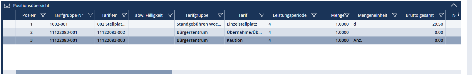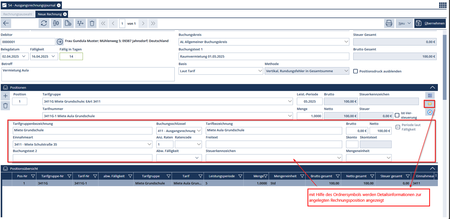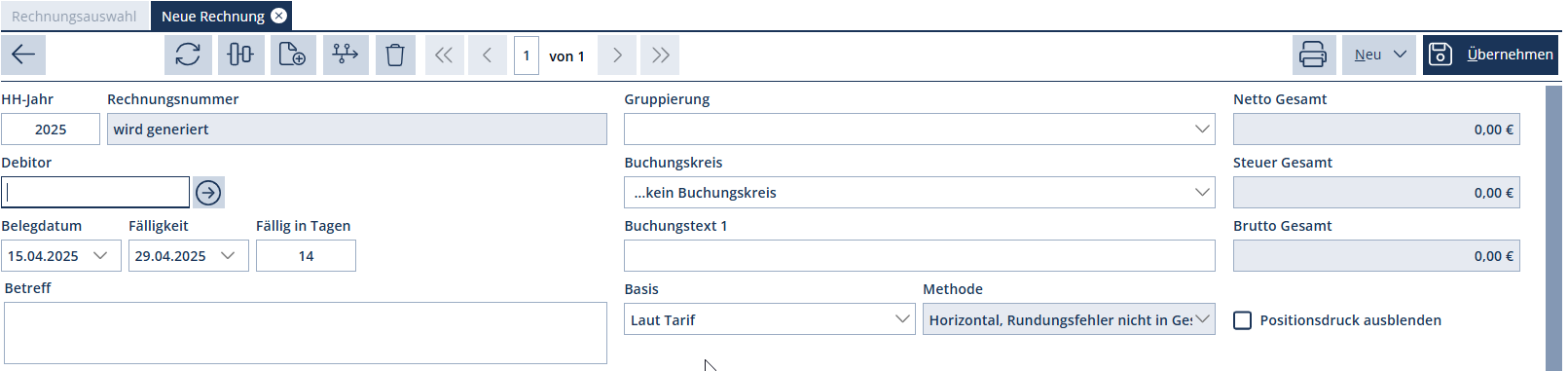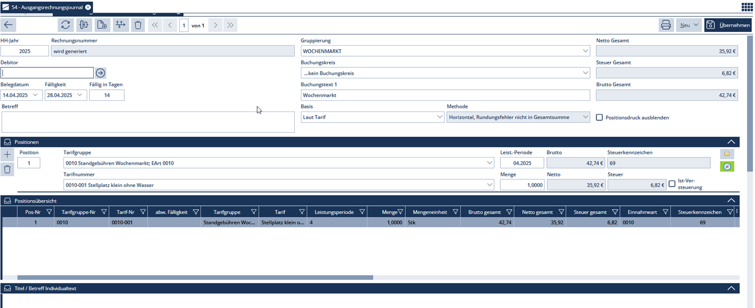 In den Kopfdaten erfassen Sie den Debitor sowie alle anderen benötigten Angaben.Über den Button : können Sie eine neue Position erfassen und im Anschluss die jeweilige Tarifgruppe mit dem entsprechenden Tarif wählen. Sollten Sie einen abweichenden Betrag benötigen, ist eine Änderung über das Ordner-Symbol rechts in der jeweiligen Positionszeile möglich. Über die darunterliegenden Panels „Titel / Betreff Individualtext“, „Oberer Individualtext“ und „Unterer Individualtext“ können die Rechnungstexte individualisiert werden.