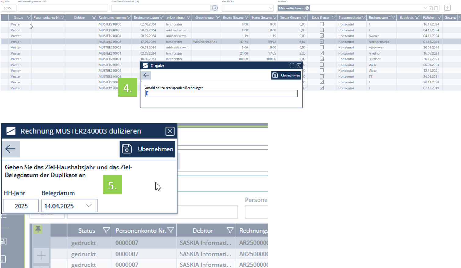 | Rechnung(en) duplizieren | Es öffnet sich der Erfassungsdialog für eine neue Rechnung mit den Daten aus der bereits erfssten Rechnung, die markiert wurde |
