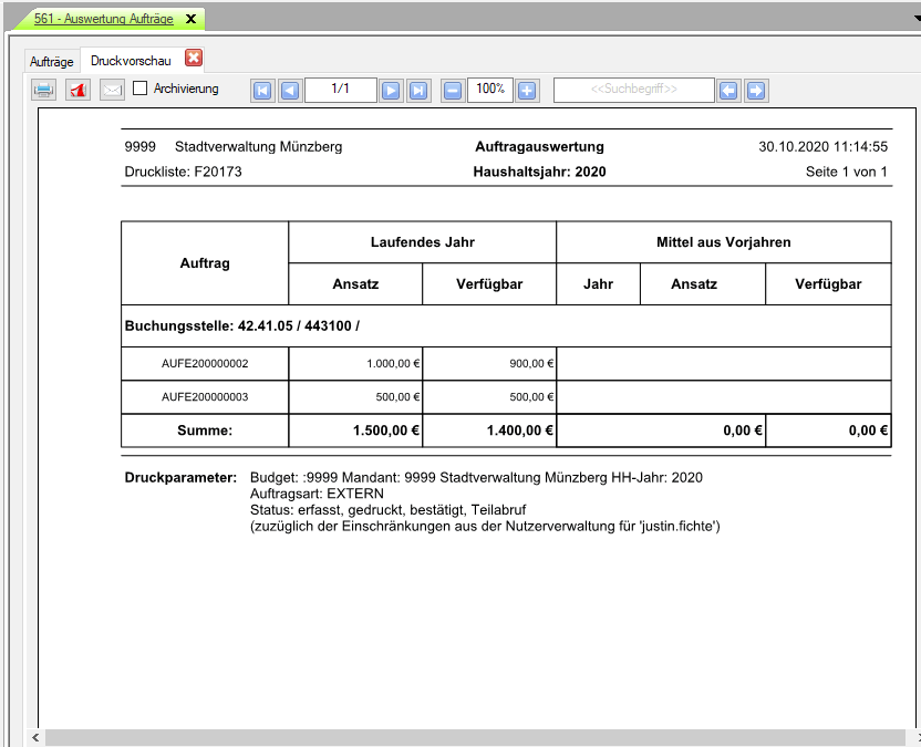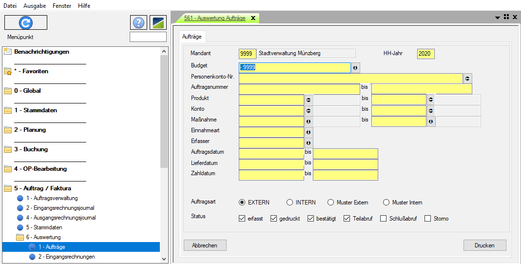 Nach Auswahl des Mandanten und des Haushaltsjahres kann durch Selektion über die verschiedenen Filterfelder eine entsprechende Auswertung der Aufträge gedruckt werden.