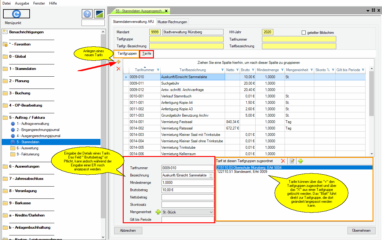 Über diesen Menüpunkt können die Tarifgruppen und Untertarife angelegt und gepflegt werden.