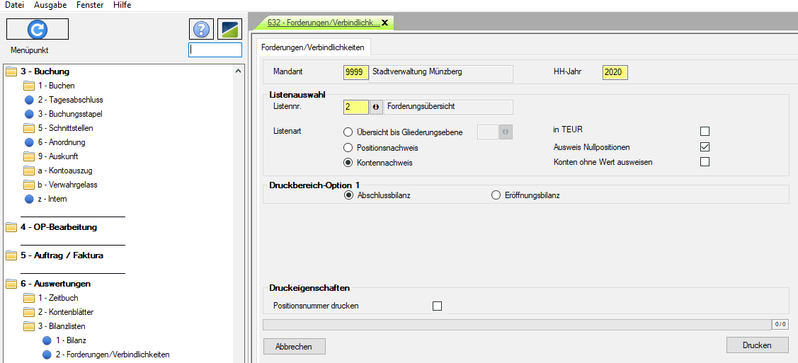 In dieser Ansicht wird nach Eingabe von Mandant und Haushaltsjahr über die Optionsfelder der Zeitpunkt für die Erstellung der Liste festgelegt. Dabei steht die Option Eröffnungsbilanz (EB) für eine Auswertung aus Sicht des 1.1. des Jahres und die Abschlussbilanz (AB) für die Auswertung per 31.12. des Jahres. Anschließend sind nun im Feld „Listennr.“ nach Auswahl der Liste „Nr. 2 - Forderungsübersicht“ oder " Nr.3 - Verbindlichkeitsübersicht" noch gegebenenfalls abweichende Sortier- oder Anzeigeoptionen auswählbar, bevor der Druck der Übersicht nach Betätigung des Buttons „Drucken“ gestartet wird.