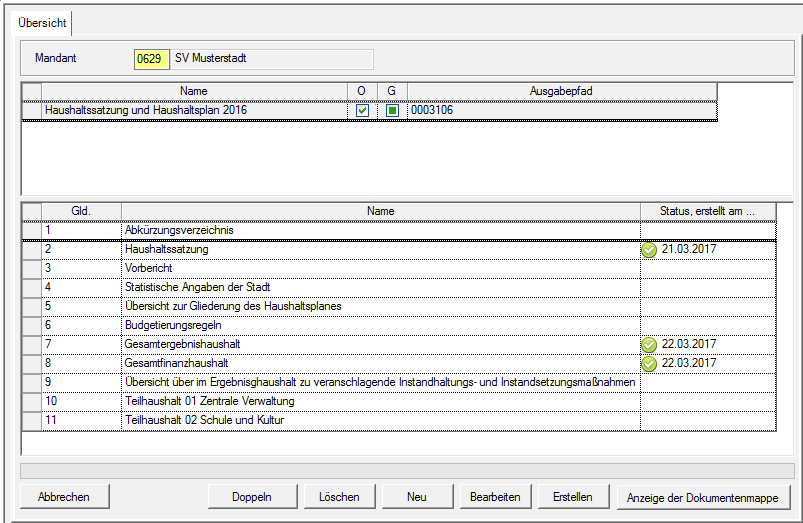 Die Dokumentenmappe im IFR dient der Zusammenstellung verschiedener Teildokumente zu einem einheitlichen, durchnummerierten und mit einem Inhaltsverzeichnis und Deckblatt versehenen Dokument. Nach Aufruf der Funktion öffnet sich die Übersicht der bereits vorhandenen Dokumentenmappen. Diese Mappen werden in der oberen Tabelle dargestellt mit ihrem jeweiligen Status dargestellt. Die Spalte „O“ zeigt an, dass die Mappe geöffnet und somit bearbeitbar ist, während die Spalte „G“ anzeigt, dass die Mappe abgeschlossen wurde und nicht mehr bearbeitet oder gelöscht werden kann. Markiert man eine Mappe mit der Maus, werden deren Gliederungspunkte innerhalb der unteren Tabelle aufgelistet.