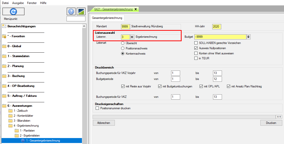In dieser Ansicht besteht die Möglichkeit abweichende Eingaben für Mandanten und Haushaltsjahr zu erfassen. Anschließend ist nach Auswahl der Liste „Ergebnisrechnung“ im Feld „Listennr.“ zusätzlich noch die Auswahl einer bestimmten Druckdarstellung über die Optionsfelder im Bereich „Listenart“ möglich. Außerdem kann der Druckbereich durch Eingabe der Periodenzeiträume auf einen bestimmten Zeitraum begrenzt werden, bevor der Druck der Übersicht nach Betätigung des Buttons „Drucken“ gestartet wird. Wird in die Auswahl die Periode 0 mit einbezogen, so werden zusätzlich die übernommenen Haushaltsreste des Vorjahres mit angezeigt. Bei Eingabe des Zeitraumes bis Periode 13 sind zu dem alle durchgeführten ÜPL/APL - und Budgetumbuchungen (automatischer Budgetausgleich) enthalten.