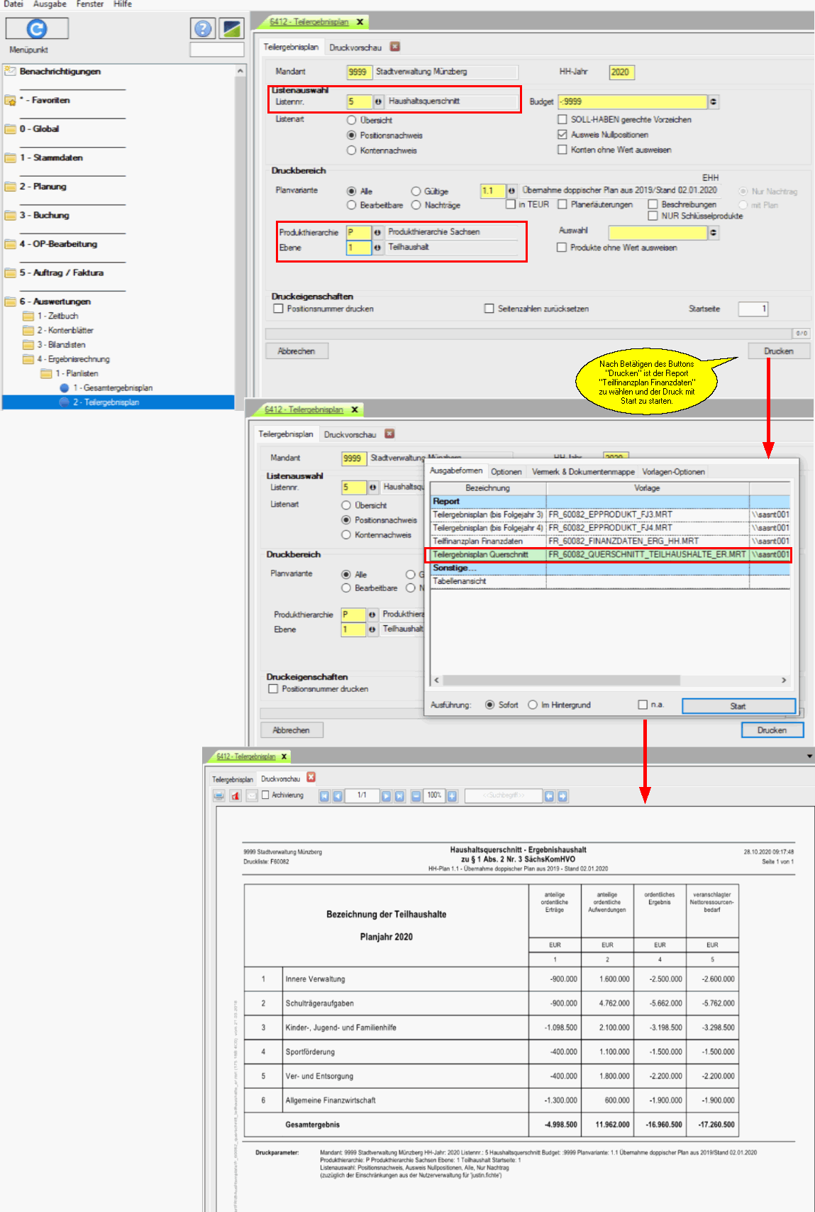 Nach Auswahl der Liste „Haushaltsquerschnitt“ im Feld „Listennr.“ findet keine weitere Einschränkung auf ein bestimmtes Budget statt. Im Bereich "Listenart" ist danach die Option "Positionsnachweis" auszuwählen. Es wird anschließend die Eingabe der Planvariante und der Produkthierarchie in den gleichnamigen Feldern vorgenommen und der Druckbereich durch Eingabe der Ebene "1" auf Teilhaushalt bzw. Produktbereich eingegrenzt. Bevor der eigentliche Druck gestartet werden kann, ist über einen Klick mit der rechten Maustaste auf den Button „Drucken“ der abweichende Report für die Haushaltsquerschnittsliste auszuwählen. Dazu wird im neu geöffneten Dialogfenster auf der Seite "Ausgabeformen" in der dortigen Tabelle unter "Report" der Eintrag "Teilergebnisplan Querschnitt" markiert und der Button "Start" betätigt.