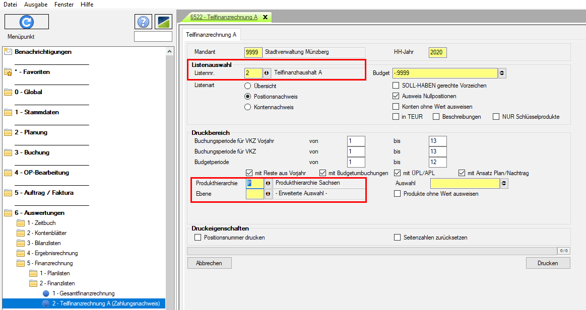 Über diesen Menüpunkt findet die Ausgabe der Jahresrechnungsliste Teilfinanzrechnung A statt.