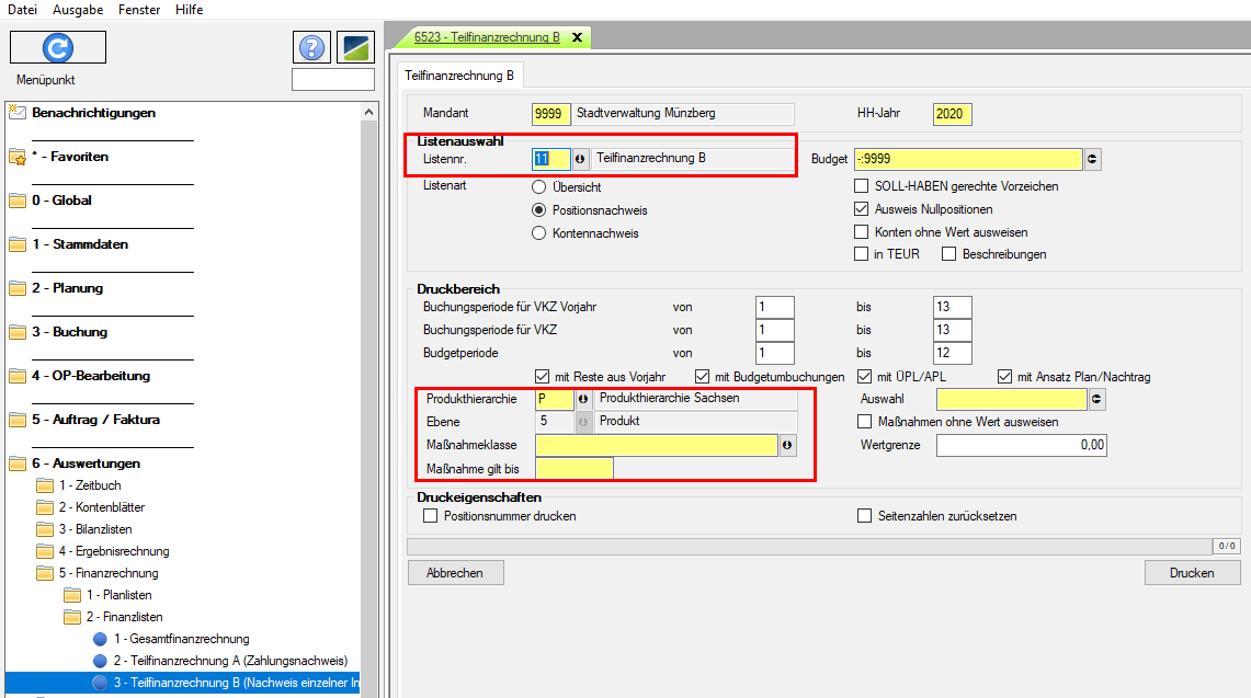 | Navigator | Auswertungen - Finanzrechnung - Finanzlisten - Teilfinanzrechnung B |