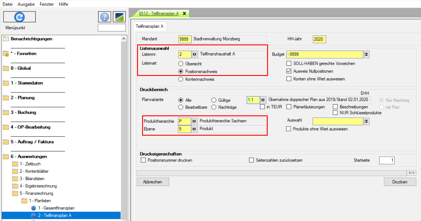 | Navigator | Auswertungen - Finanzrechnung - Planlisten - Teilfinanzplan A |