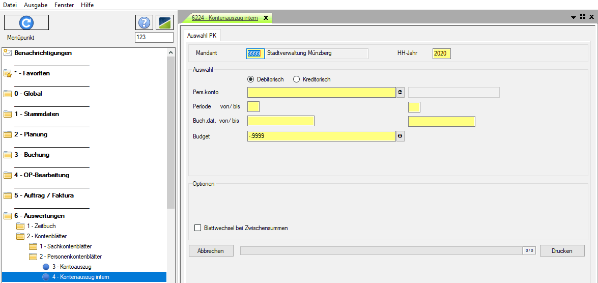 Zunächst wählen Sie Mandant und Haushaltsjahr aus, danach Debitorisch oder Kreditorische und das Personenkonto bzw. den Personenkontenbereich für den der Auszug erstellt werden soll.Optionsfelder:
