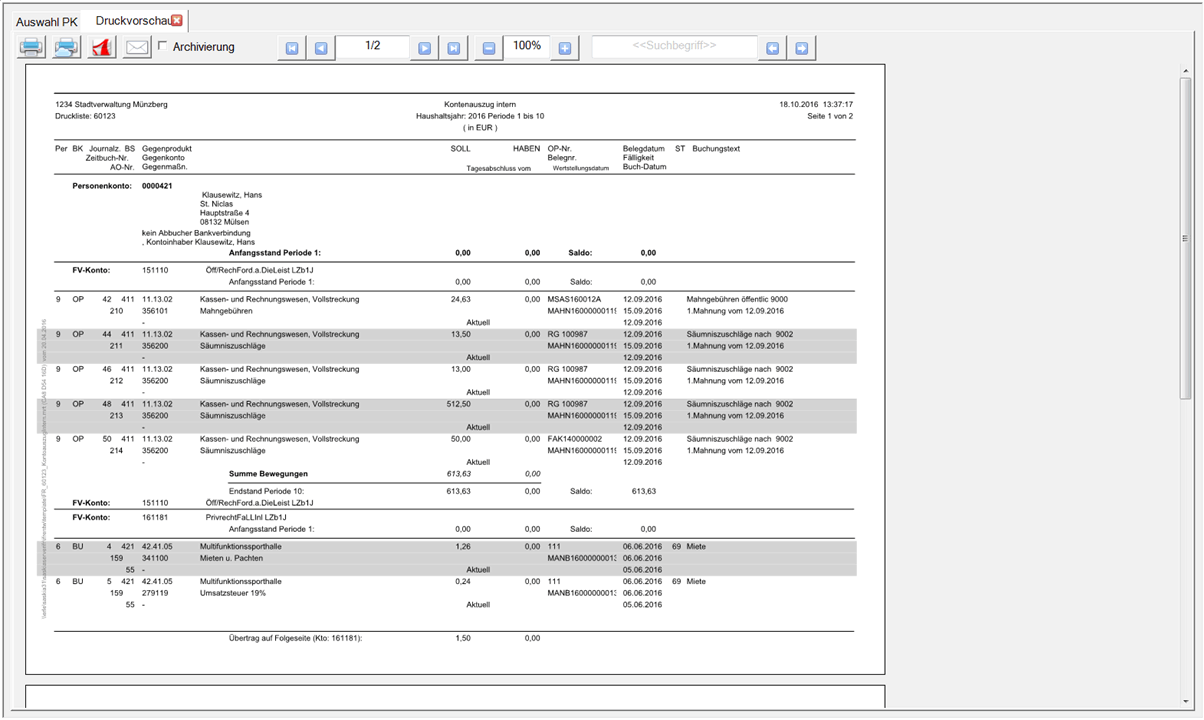 Außerdem kann der Personenkontenauszug für eine bestimmte Periode bzw. einen bestimmten Periodenbereich ausgegeben werden. Periode wählen über: