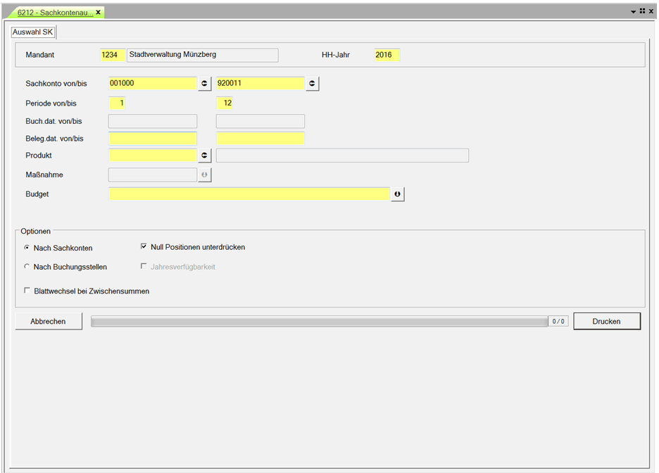 Es wird nach Eingabe von Mandant und Haushaltsjahr das Sachkonto bzw. der Sachkontenbereich und der Zeitraum eingegeben, für den der Auszug erstellt werden soll. Außerdem kann der Sachkontenauszug produktbezogen ausgegeben werden, dazu ist eine entsprechende Eingabe im Selektionsfeld „Produkt“ vorzunehmen. Wird in den Druckoptionen die Ausgabe "Nach Buchungsstellen" gewählt, besteht zusätzlich die Möglichkeit, die Option "Verfügbarkeiten ausweisen" zu nutzen. Dabei liefert der Sachkontenauszug bei Eingabe eines Zeitraumes von einem Jahr (von Periode 0 bis 12) unter jeder aufgelisteten Buchungsstelle einen aktuellen Stand der verfügbaren Mittel.