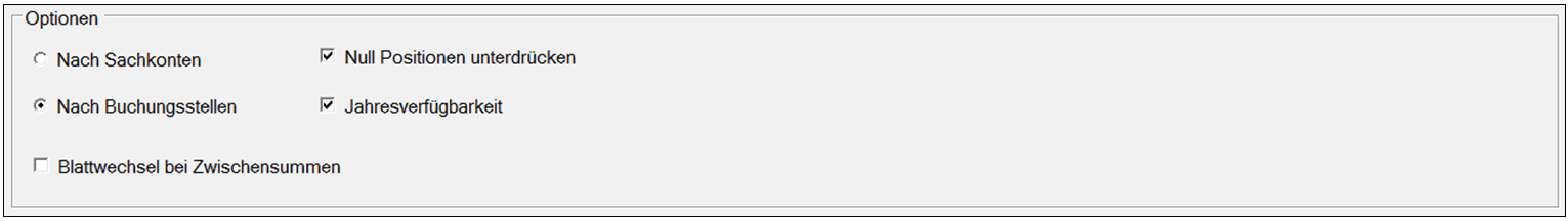Wird in den Druckoptionen die Ausgabe "Nach Buchungsstellen" gewählt, besteht zusätzlich die Möglichkeit, die Option "Jahresverfügbarkeiten" zu nutzen.