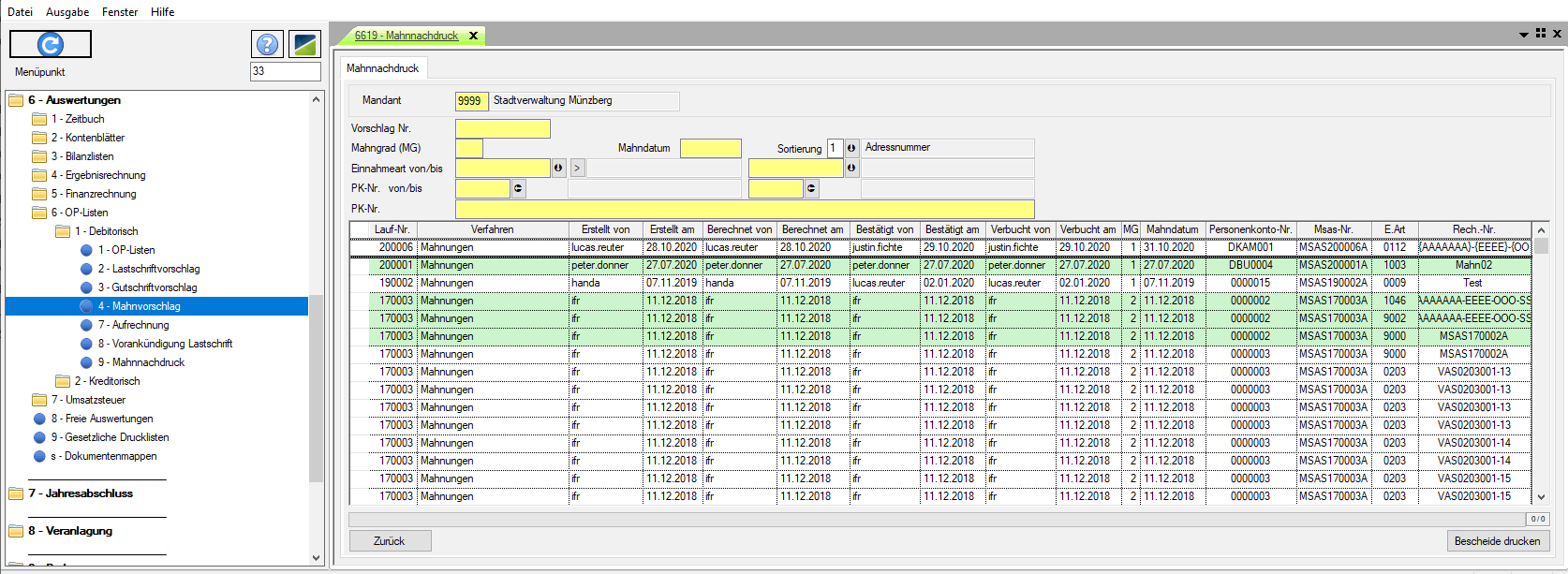 Durch Drücken der Taste F5 werden alle bisher erstellten Mahnungen angezeigt und können entsprechend nachgedruckt werden. Dazu wählen Sie sich eine Mahnung oder durch gedrückt halten der linken Maustaste mehrere Mahnbescheide aus.