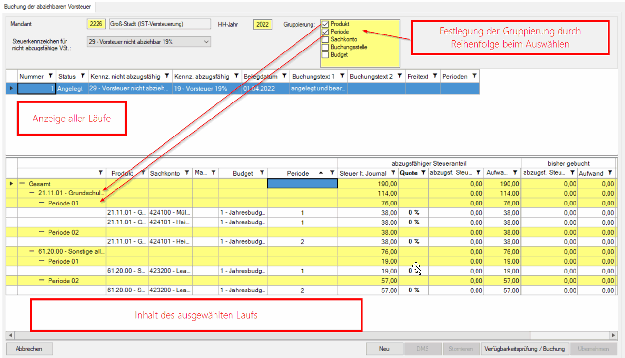 Standardmäßig erfolgt die Gruppierung nach Produkt und Periode. Mit der Verwendung der Optionen können weitere Gruppierungen hinzugefügt oder entfernt werden. Die Reihenfolge der Aktivierung definiert die Reihenfolge der Gruppierung.