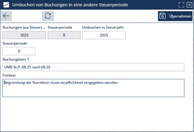 | Korrektur Steuerperiode | Ausgewählte Buchungen werden in andere Steuerperiode gebucht |