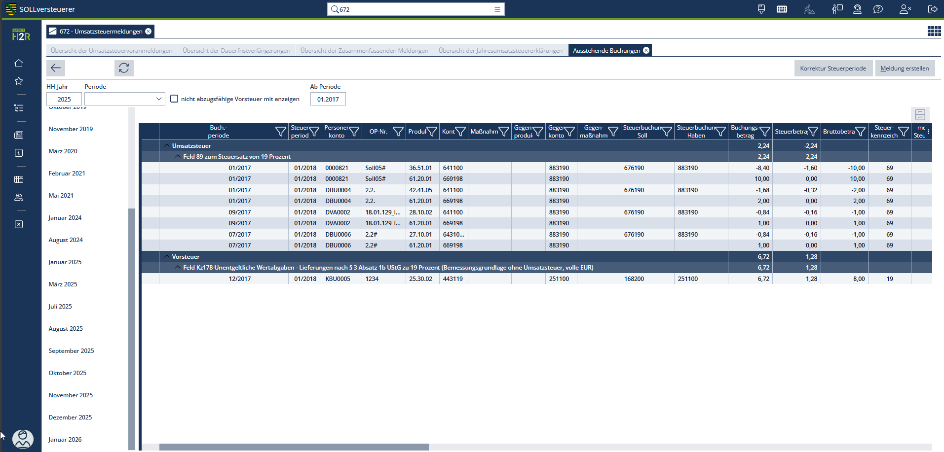 Nach Klick auf den Monat im linken Bereich der Maske werden alle zugehörigen steuerlichen Buchungen ausgegeben. Die Anzeige kann dabei über verschiedene Filter- und Gruppierungsmöglichkeiten eingegrenzt werden. Die Arbeit mit dieser Recherche erfolgt analog der Tabelle in der Steuerbuchungsrecherche.