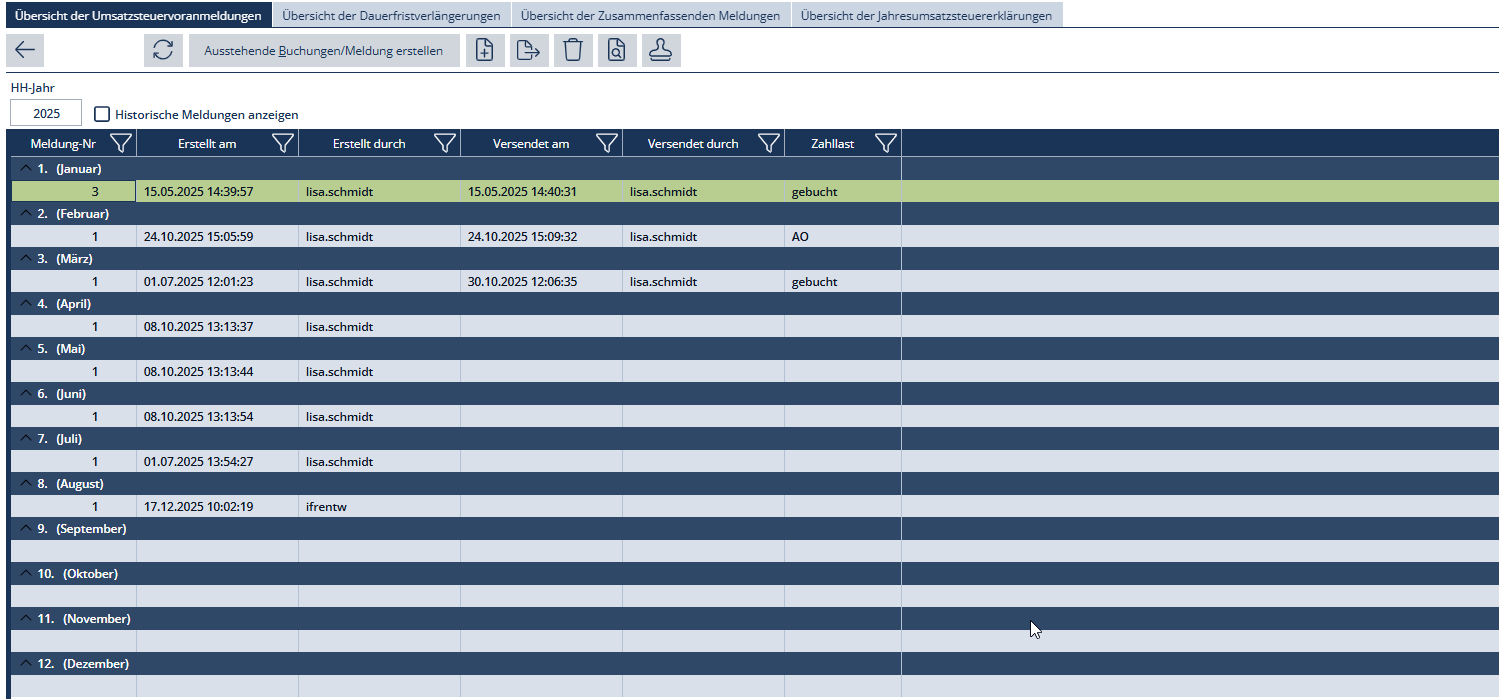 | Meldung erstellen | Meldung für alle Buchungen der gewählten Periode erstellen bzw. an vorhandene Meldung anfügen |
