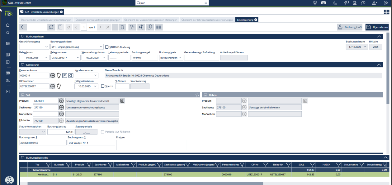 Mit dem Verwenden der Funktion "Zahllast buchen" öffnet sich die Buchungsmaske mit den voreingestellten Informationen zu Personenkonto und Buchungsstelle. Den Buchungsschlüssel und das Personenkonto ermittelt das System selbständig in Abhängigkeit vom Vorzeichen der Umsatzsteuerzahllast in der ausgewählten Meldung.