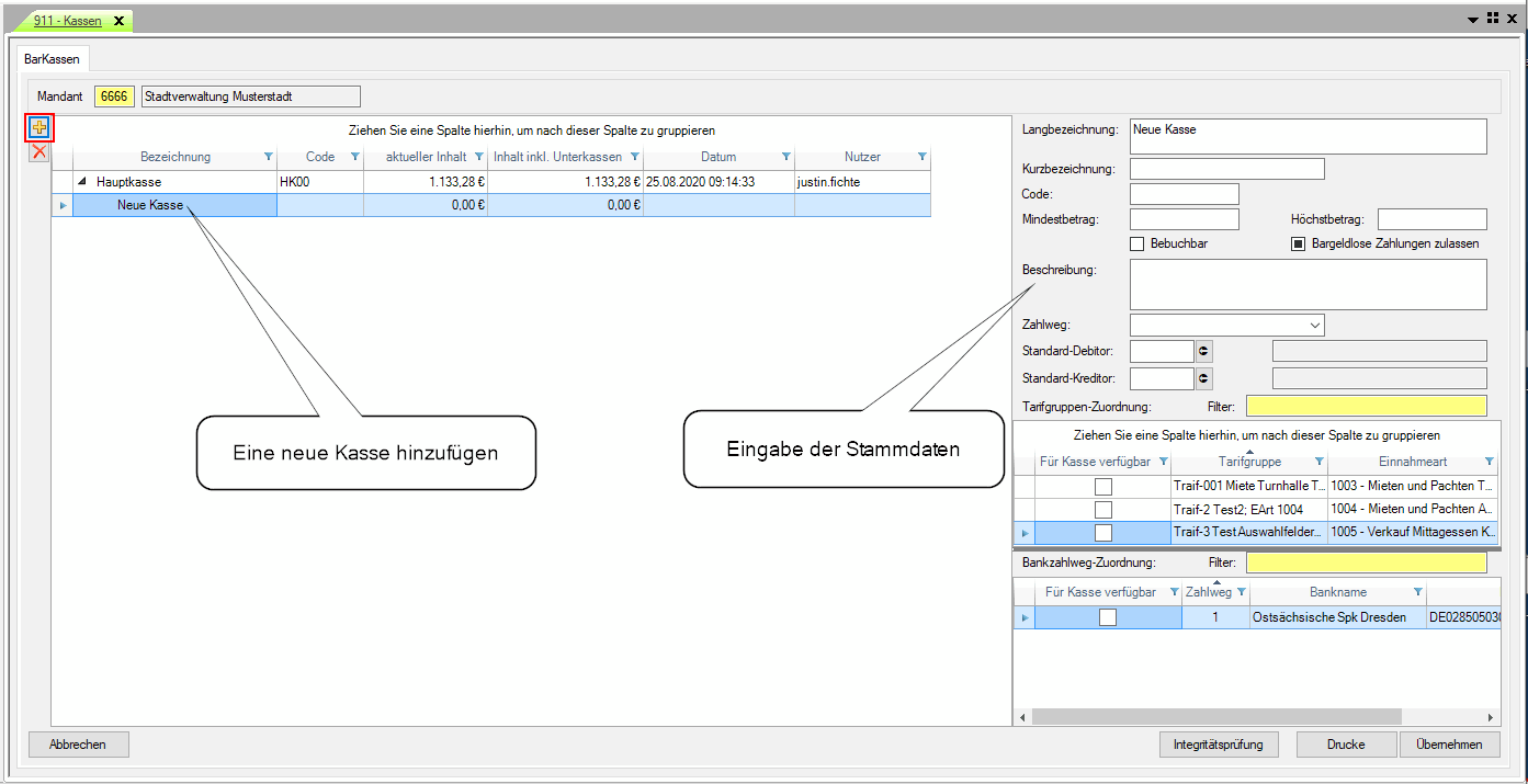 Mittels dieses Menüpunktes können Barkassen angelegt und die Stammdaten administriert werden. In der Systemverwaltung wird über das Recht "Barksse" der Zugriff von Mitarbeitern auf die Barkassen festgelegt.