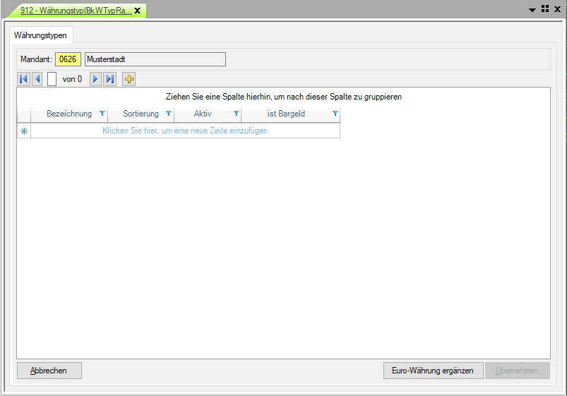 Mittels dieses Menüpunktes können unterschiedliche Währungstypen (Euro, Wertschecks, Postwertzeichen) gepflegt werden.