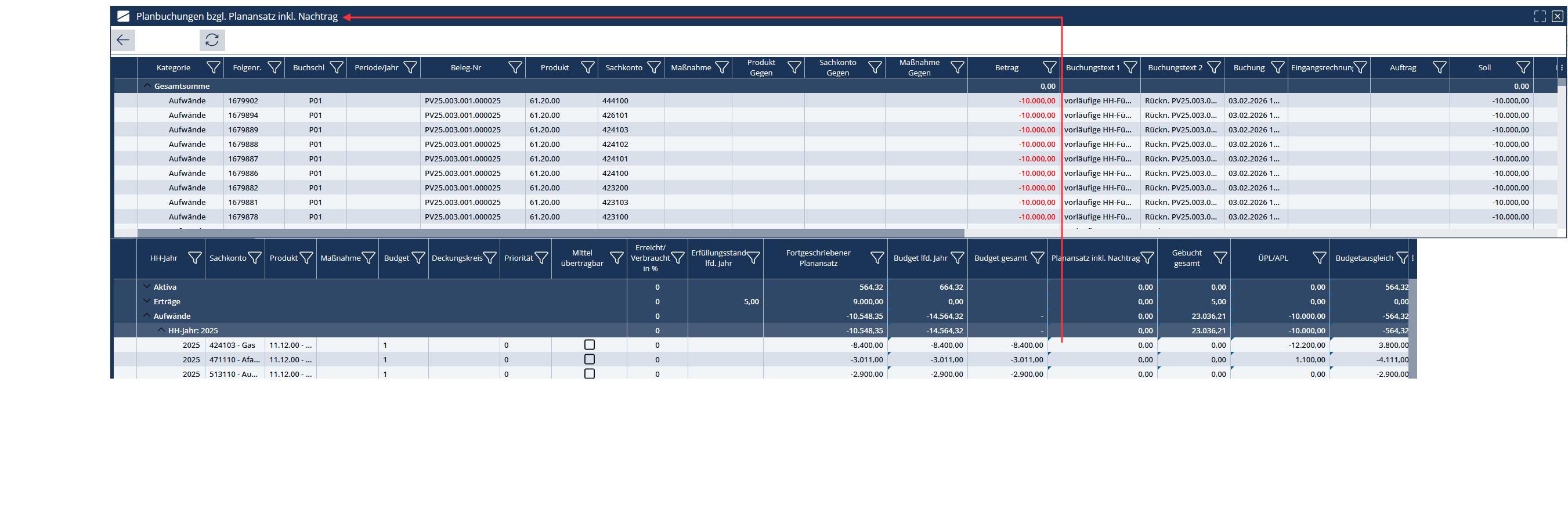 Bei Feldern die mit einer blauen Fahne markiert sind, besteht die Möglichkeit in die Planungs- und Bewirtschaftungsbuchungen abzuspringen – auch in diesem Fenster können Sie Gruppierungen und Filterungen vorgenommen werden: